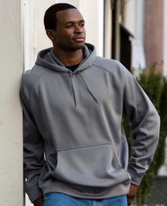 Smooth finished polyknit bonded to microfleece (8.55oz). Traditional sweatshirt design with drawstrings at hood. Front pouch pocket. Banded hem and cuffs