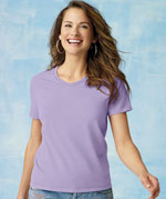 5.2 oz., 100% ComfortSoft® cotton v-neck t-shirt. Tag-free neck label. Relaxed feminine fit. Narrow rib knit collar. Hemmed sleeves.